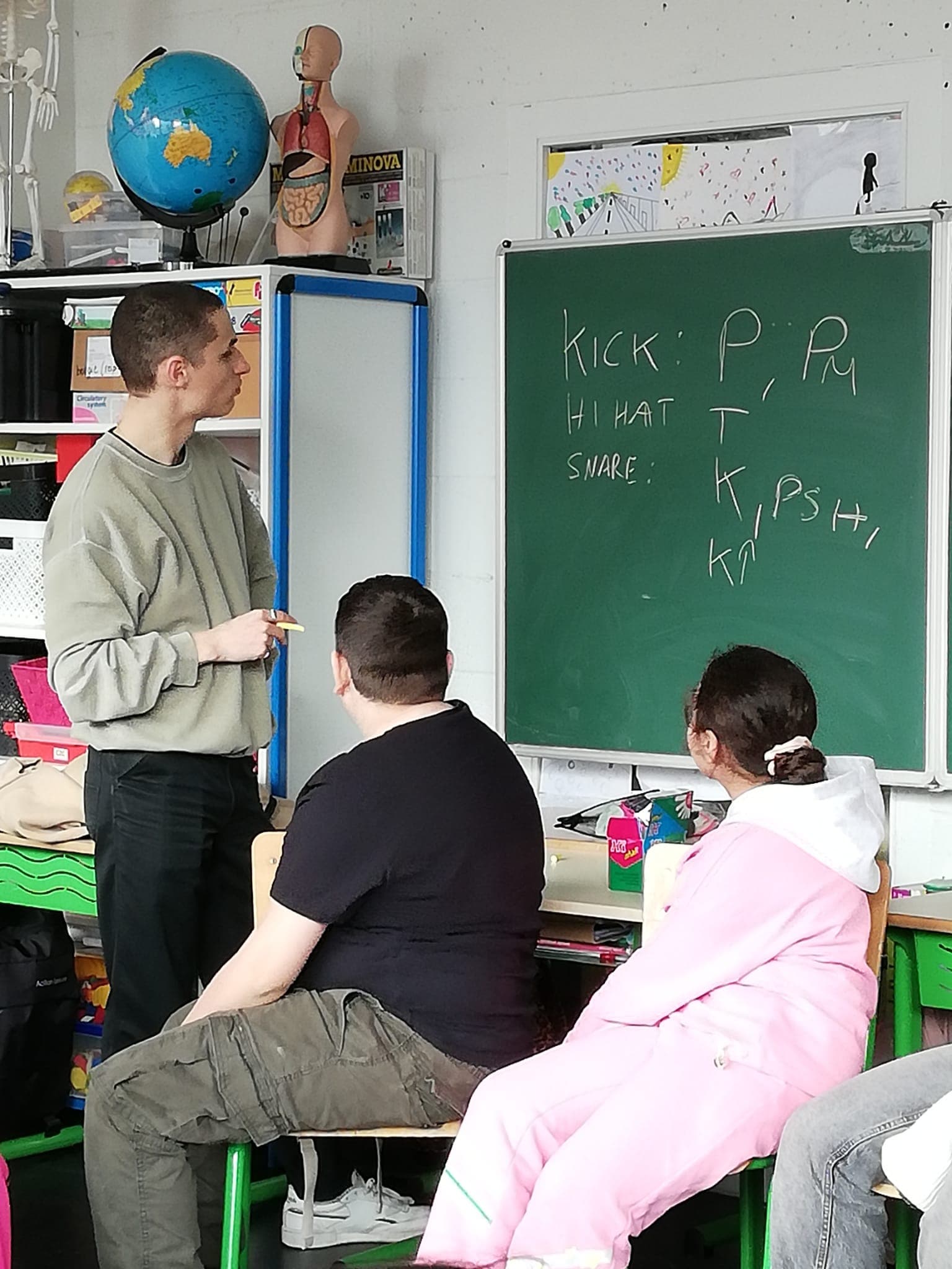 - Initiation technique : reproduction de sons, apprentissage de phrases rythmiques simples, et répétition en solo ou en groupe.