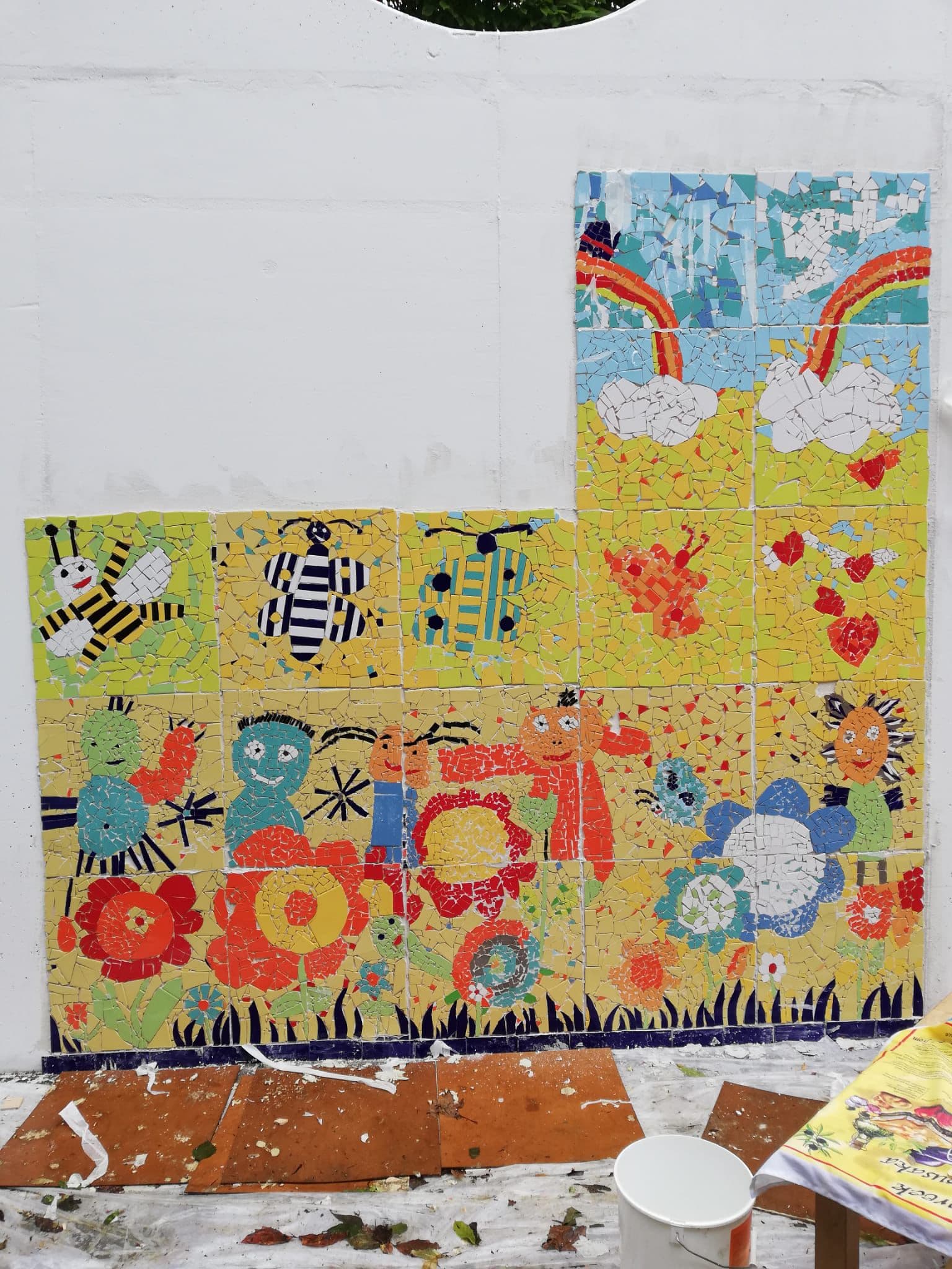 • Création collective : Accompagnement des enfants dans la réalisation d’une fresque mosaïque. Dans le cas représenté ici, l’éco responsabilité est envisagée par des thèmes liés à la terre, l’eau et la gestion des ressources. Des dessins préparatoires sont réalisés afin de composer la fresque.